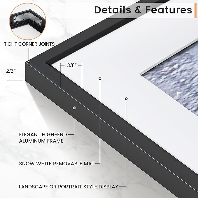 - Display Precious Memories - Showcase your cherished moments with our 11x14 metal frame, meticulously crafted from premium aluminum alloy. It's lightweight yet sturdy with a superior quality finish. The white mat opening (measuring 7.5x9.5) is perfect for a 8x10 picture with the mat, or an 11x14 picture without it.