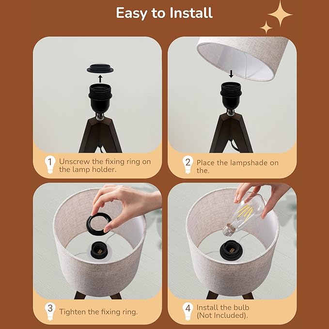 - Easy Installation: Table lamps for living room has a simple design. You only need to tighten the lampshade, socket ring and tripod base to complete the installation in minutes. The lamp can be easily turned on and off through the switch on the power cord. The small table lamp is equipped with a standard E26 socket and is compatible with incandescent lamps, LED bulbs, etc. (the bulb is not included).
