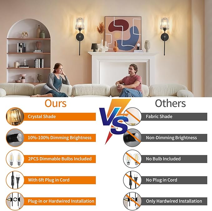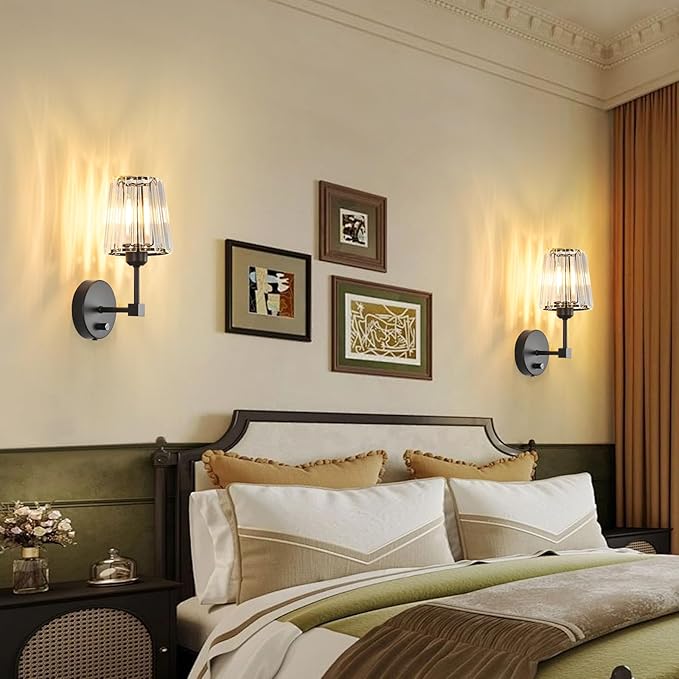 - Crystal Wall Sconces: Clear crystal wall sconces sets of 2 are made of durable metal with a classic matte black finish and a finial at the end of the horizontal bar and crystal shades. The details on this sconce are what stand out. The crystal design is amazing. Its crystal shade is sparkle and glamour. When the light is on, it looks like frozen champagne, creating a captivating visual effect, compared to traditional fabric shade, our crystal wall lights look more elegant