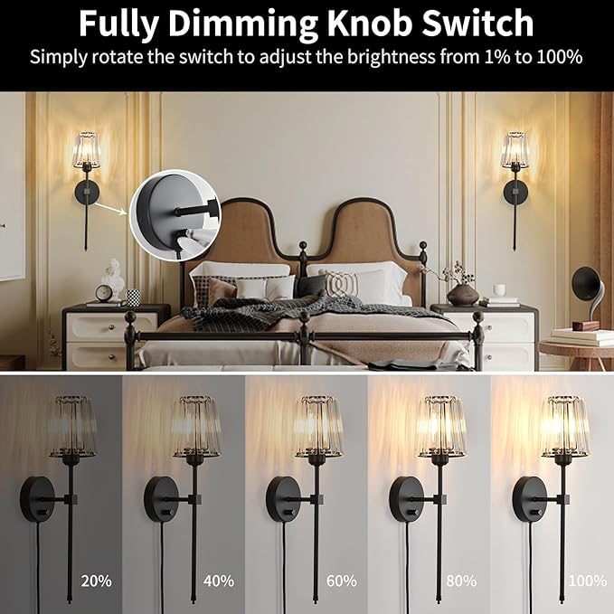 - Two Dimmable LED Bulbs Included: Matte black crystal wall lights come with 2 dimmable LED bulbs. The bulbs emit 3000K warm light, only consume 5W, which save more energy and electric bills. And the modern wall lights are with dimmer knob switch, simply rotate the switch to adjust the brightness from 10% to 100%. Fully dimmable wall lights to meet all your light needs