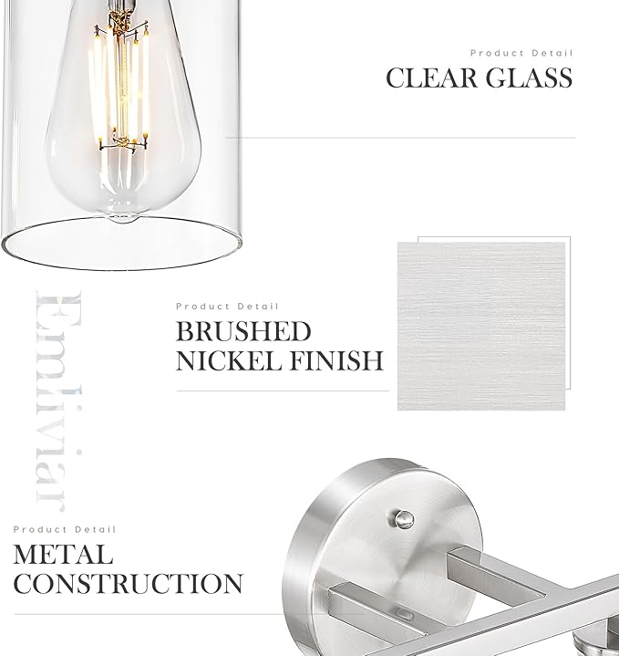 - The wall mount bath light is made of metal construction. The clear glass emit a more enchanting light. This brushed nickel finish is suitable for any home style.