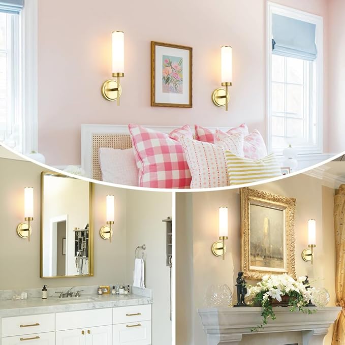 Gold Wall Sconces Set of 2, Modern Bathroom Sconces Wall Lighting with Opal White Glass, Vanity Light Fixtures for Bathroom, Brushed Brass Wall Mount Lights for Living Room Bedroom Hallway, Hardwired