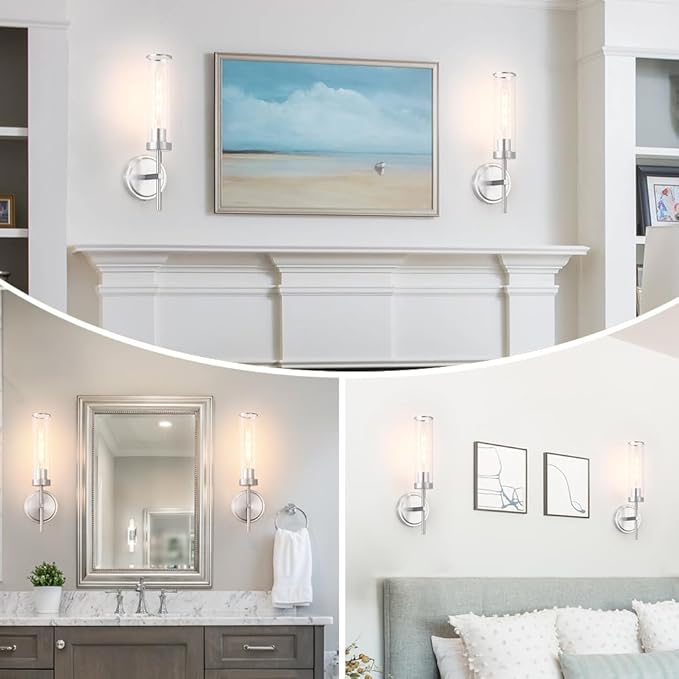 - 【Classic Design】DSMJFU set of 2 wall sconces are made of fine aluminum body and silky glass shade. The combination of brushed nickel and clear colors creates a perfect visual display, which can showcase a elegant atmosphere for indoor lighting decoration