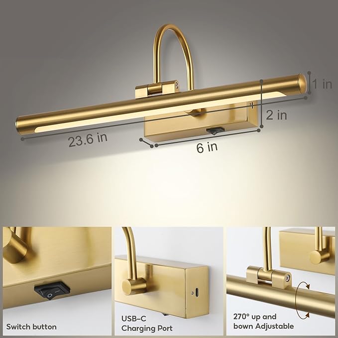 - Battery Operated Picture Light: This 23.62 inch picture light features a built-in 9000mAh rechargeable battery and includes a USB-C charging cable. Eliminating the need for hard wiring, this gold wireless art light is entirely battery-powered. A single charge provides extended use, lasting up to 30 hours at its lowest brightness setting.