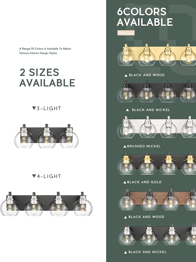 - INSPIRED DESIGN: Our 4 light bathroom light fixtures feature a combination of clear glass globe shades and a black and brushed nickel metal long base back plate, creating a fusion of timeless elegance and modern minimalism. These bathroom lighting fixtures over mirror are the ultimate choice for your bathroom lighting needs
