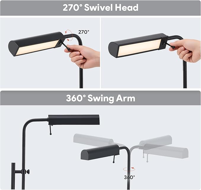 - Fully Adjustable Design: With an adjustable height ranging from 42.5" to 62.5", a 360° swing arm, and a 270° swivel head, this LED floor lamp is designed to meet all your lighting needs—from cozy reading nooks to office workstations