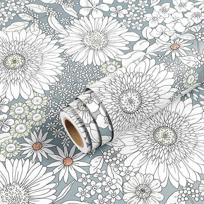 Livelynine 17.5x276 Blue Peel and Stick Wallpaper Boho Floral Minimalist Flower Wallpaper for Bathroom Nursery Renter Friendly Elegant Light Blue Dainty Floral Contact Paper for Kitchen Cabinets