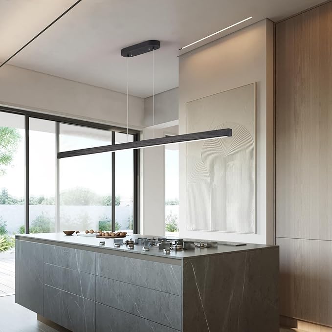 55 Inch LED Linear Pendant Light Black Wood LED Kitchen Island Lighting Dimmable Ceiling Hanging Chandeliers for Dining Room Living Room Bar Pool Table 36W Modern Farmhouse Fixture Black Wood Finish