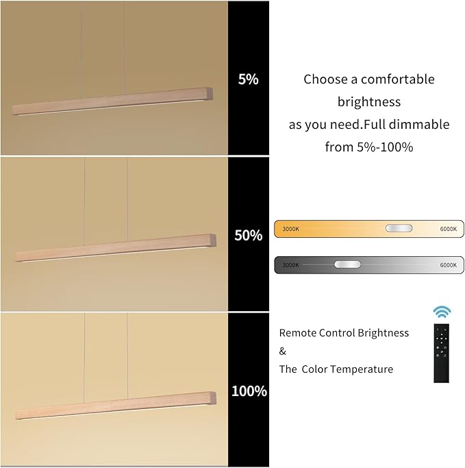 - 【Energy-Saving Lighting】:This dining table light fixture is a whole 40 watt energy-saving led light source life of 50000 hours,Super long life light source, late need not consider the replacement of light source.3000 Lumen,Dimmable,Remote controls color temperature and brightness:Meet your different scene lighting needs.This LED light source has no blue light and no flicker, protecting the eyes.(CRI>90)makes the food on your table look more delicious.
