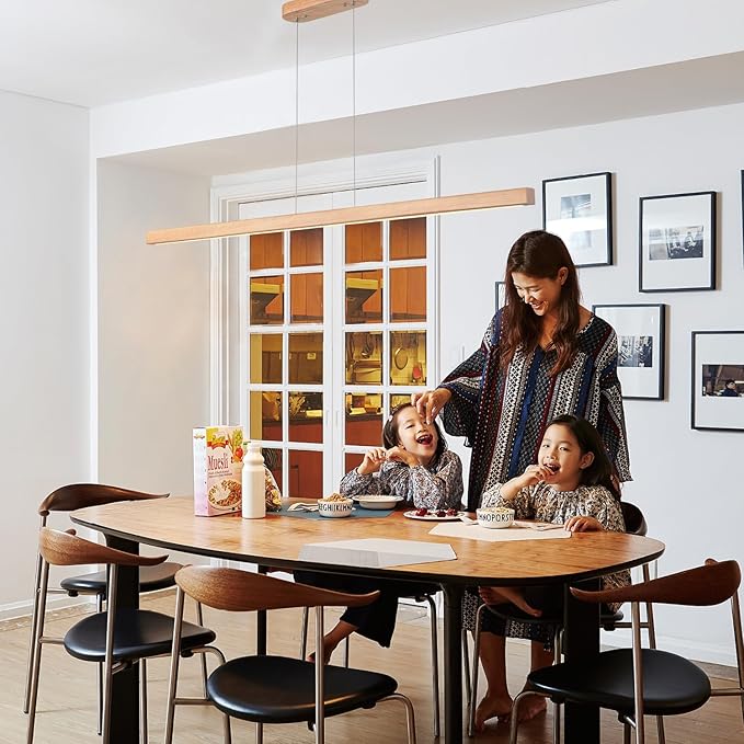 55" Wood Linear Pendant Modern Kitchen Island Light Fixture with Remote Solid Wooden Hanging Ceiling Light Chandeliers for Dining Room Kitchen Pendant Lighting Over Island Natural