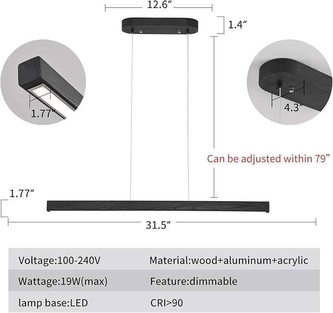 - 【Versatile Statement Lighting】More than a chandelier—it's an art piece. The low-profile Adjustable height avoids sightline interruptions while casting a museum-grade gallery glow over 4-seat tables.This linear dining light has 2 adjustable wires,you can adjust the length of the cable by simply unscrewing the screws that hold the cable in place. (Please measure the best length required for the cable before installation. It is generally recommended that the lamp be about 39 inches away from the desktop. Then install ceiling fixtures)The maximum height of this Walnut island hanging light fixture can be adjusted to 79inches (200cm). You can adjust this chandelier according to the place.