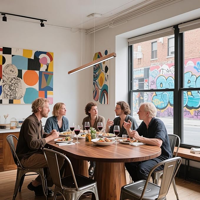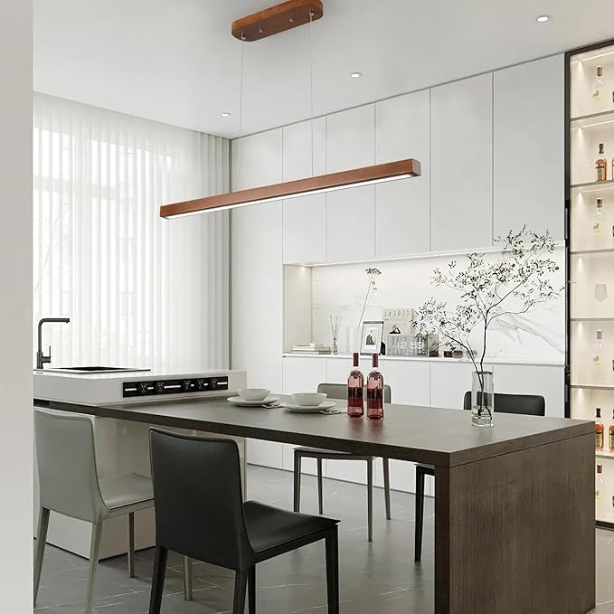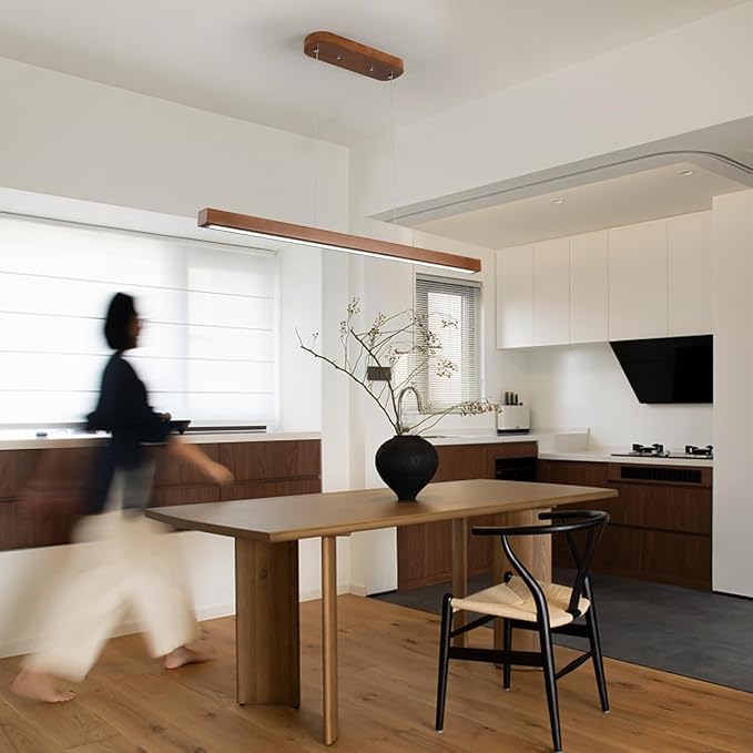 - 【Elegant Solid Walnut Design】Crafted from premium kiln-dried walnut wood, this linear pendant light exudes organic warmth and Scandinavian-inspired minimalism. The clean, uncluttered lines blend seamlessly with farmhouse, mid-century, and contemporary interiors, transforming your kitchen island or dining table into a sophisticated focal point.This LED pendant kitchen island lights Color:Walnut,size:39"(L)*1.7"(W)*1.7"(H) The mounting part:12.6 x 4.3 x 1.4 inches(l*w*h) Compatible with standard junction boxes. NOTICE:please do not use dimming switch,dimming equipment has been configured inside the light,please use ordinary wall button switch.otherwise the light fixture may flicker.