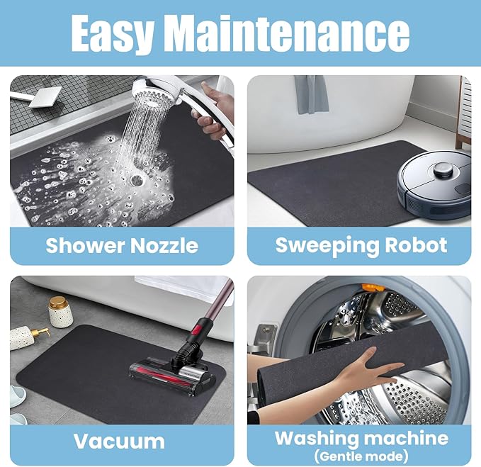 - 【Easy to Clean】Bath mats with new hair-free technology layer, water evaporates quickly, dirt attach to the surface,stain-resistant and easy to clean. Therefore, you don’t need to dry or clean the washable bath mat every day. If you want to clean it after long-time use, simply wipe the washable bathroom rugs with a wet cloth, or rinse it with shower nozzle. The bath rug for bathroom looks as good as new now