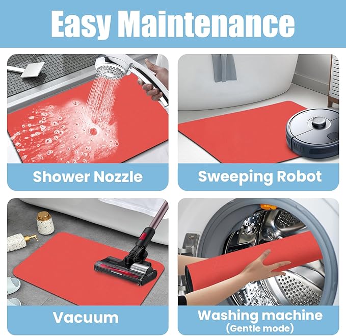 - 【Easy to Clean】Bath mats with new hair-free technology layer, water evaporates quickly, dirt attach to the surface,stain-resistant and easy to clean. Therefore, you don’t need to dry or clean the washable bath mat every day. If you want to clean it after long-time use, simply wipe the washable bathroom rugs with a wet cloth, or rinse it with shower nozzle. The bath rug for bathroom looks as good as new now