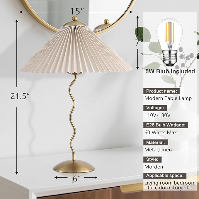 Pleated Table Lamp, S Tube Modern Table Lamp for Bedroom, Bedside Lamps with Organic Textured Linen Lampshade for Nightstand Bedroom Home Office Decor, Gold