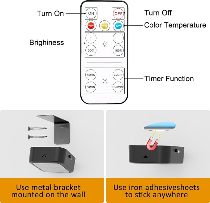 - ⏰【TLIMING & 🔅 BRIGHYNESS】This art lighting for paintings wireless remote control has a timing function: set the picture light to turn off automatically after 15 minutes, 30 minutes, 60 minutes, 120 minutes. Dimmable :10-100% brightness adjustment according to your needs.