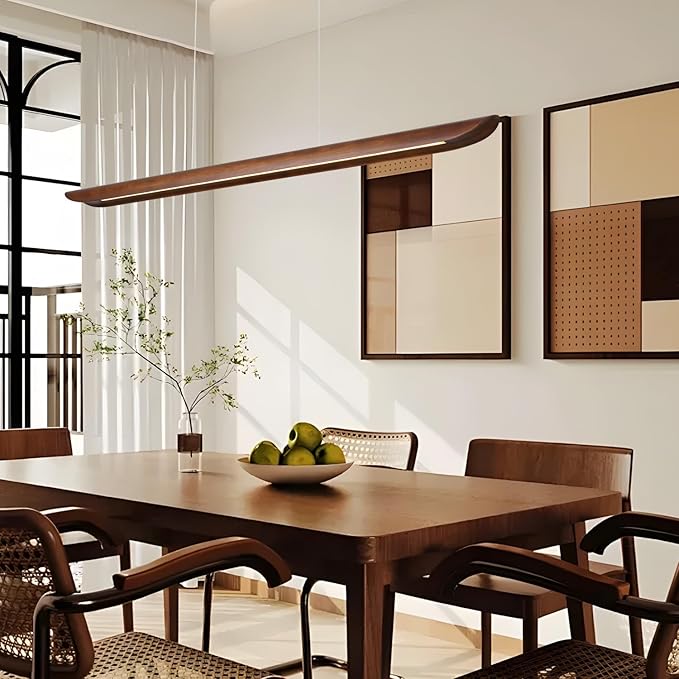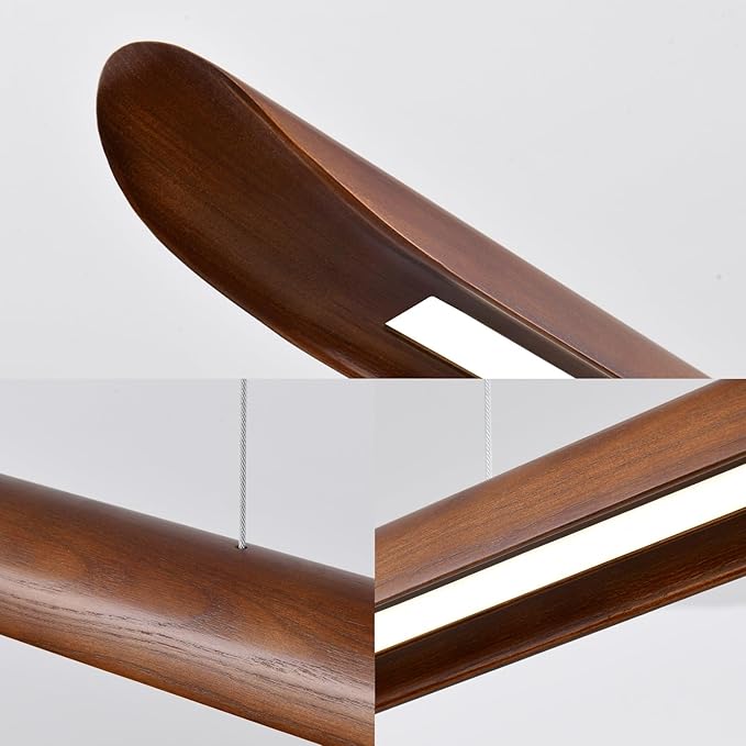 - 【Artful Light for Every Space】More than a chandelier—it's an art piece. The low-profile Adjustable height avoids sightline interruptions while casting a museum-grade gallery glow over 6-8-seat tables. This linear dining light has 2 adjustable wires,you can adjust the length of the cable by simply unscrewing the screws that hold the cable in place. (Please measure the best length required for the cable before installation. It is generally recommended that the lamp be about 39 inches away from the desktop. Then install ceiling fixtures)The maximum height of this Walnut island hanging light fixture can be adjusted to 79inches (200cm). You can adjust this chandelier according to the place.