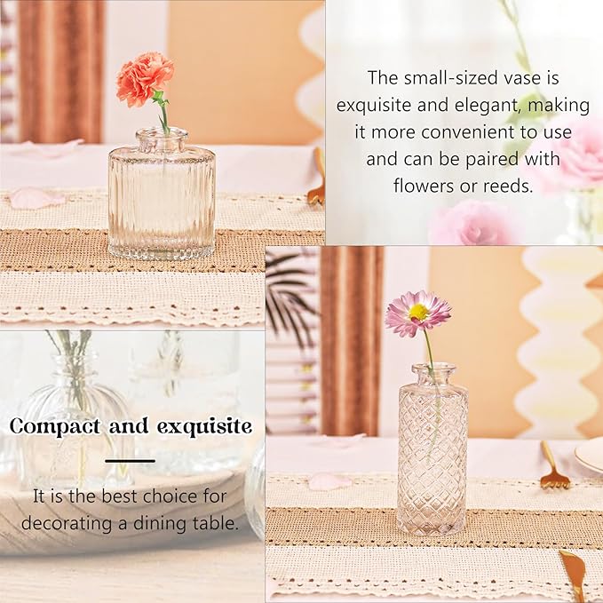- Mini glass vase:bud vase in bulk are small in size and don't take up too much space. The bottle mouth is smooth and large enough to match flowers, candles, oils, aromatherapy sticks, etc., making your wedding, party, etc. full of romantic and retro atmosphere.