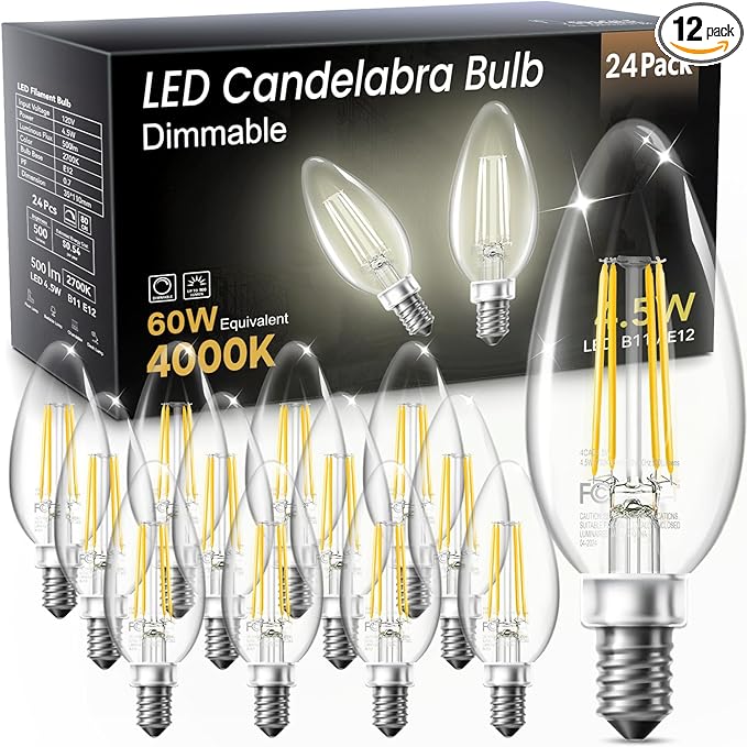- 【Energy saving and durable】These 4.5w B11 LED candelabra bulbs are dimmable and compatible with most dimmers on the market. LED candelabra bulbs do not produce UV rays and the estimated annual electricity bills is $0.54. With three hours of use per day, these bulbs have an average lifespan of 13.7 years