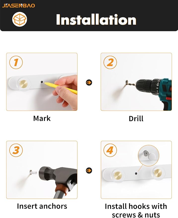 - Drilling Install : Install the coat racks with screws and expansion tubes (included) ideal for hanging towel, coat, robe, hat, bag, backpack