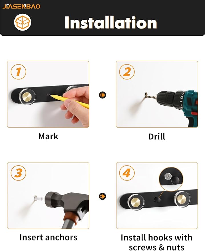 - Drilling Install : Install the coat racks with screws and expansion tubes (included) ideal for hanging towel, coat, robe, hat, bag, backpack