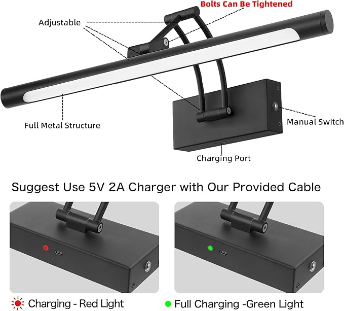 - 16 inch Rechargeable Picture Light - Neymlya battery operated picture light features built in long-life batteries, delivering 10 hours of use at maximum brightness or 48 hours at minimum brightness after just 5-6 hours of charging. Compared to other market options, our art light comes with a 1.5m (4.9ft) charging cable for enhanced flexibility and convenience. Important Note: We suggest use 5V 2A power adapter for fast charging