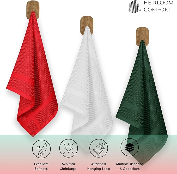 12 Pack Multi Color Waffle Weave Kitchen Towels, 16x26 Inch, 100% Cotton, Super Absorbent, Quick Dry, Hand Towels for Drying Dishes, Cleaning, Durable - Red, White, Forest Green