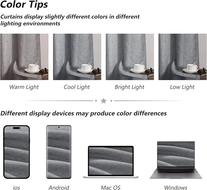 - Light Filtering & Airy: Beautifully frames your windows with a soft and hazy vision. Linen textured curtain draperies don't completely block the sunlight but gently filtering out harsh sunlight. The open weave lets in plenty of fresh air when you have the curtains closed but window open