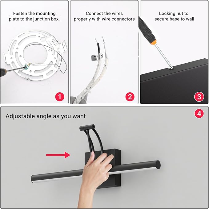 - [Adjustable Light Direction]:Crafted from durable aluminum with a PC cover,the light tube on our led lights for bathroom is built to last and resistant to oxidation.Dimmable art Lights can be rotated 270° up and down,you can easily adjust and direct the light exactly where you need it most,providing optimal illumination for your space.