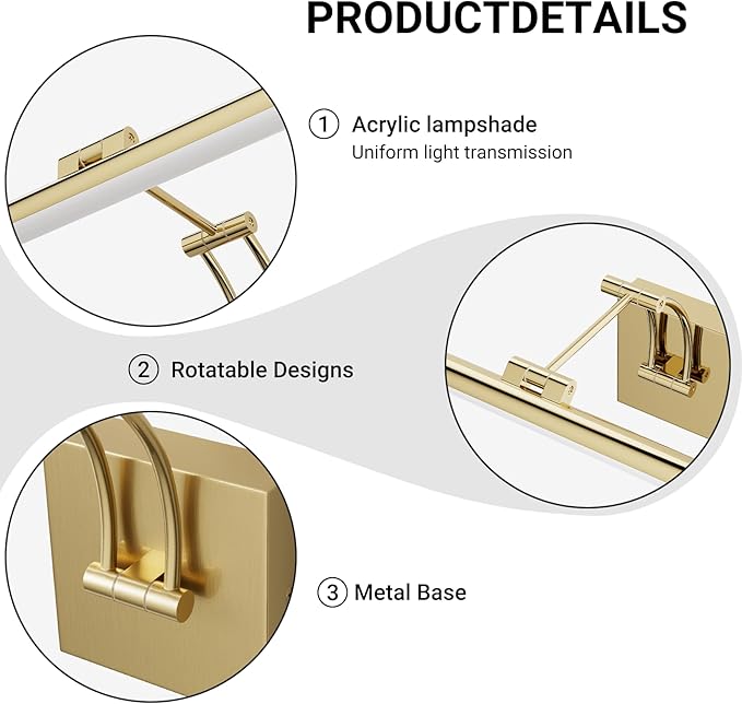 - [High CRI & Shinning Pictures]:The classic LED picture frame light offers a Color Rendering Index (CRI) of 90+.This led picture light will bathe your art in natural-looking light,illuminating every detail and breathing life into every piece.Our art lamps emit very minimal heat and harmful UV output,ensuring the longevity of your precious artwork.