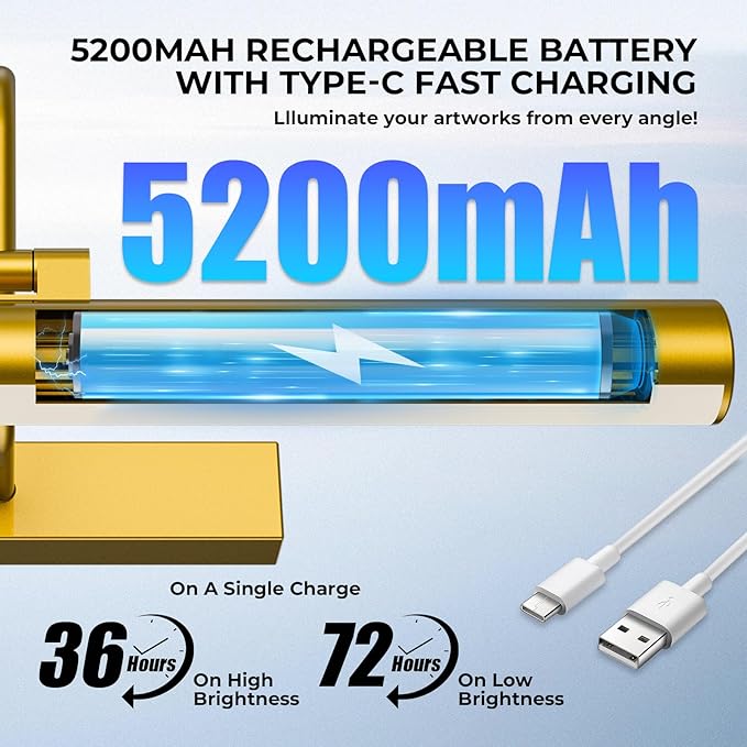- 【Wire-Free Freedom, Long-Lasting Power】Say goodbye to messy cords and limited outlet access. Our mural light features a 5200mAh rechargeable battery that cuts the cord entirely, letting you mount it anywhere your art lives. And the battery life? Impressive, to say the least—up to 36 hours on high brightness for all-day display, or a whopping 72 hours on low for extended use. When it’s time to recharge, the convenient TYPE-C port gets it back to full power quickly. No more interrupting your art’s spotlight—just reliable, long-lasting illumination.