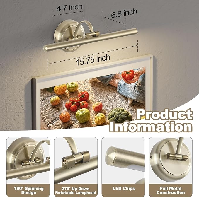 - High-Quality Material: The LED picture frame lights for paintings is made of full metal construction for reliability and durability. The exquisite plating and smooth finish of the picture lights for wall provide a luxurious texture that ensures style and practicality