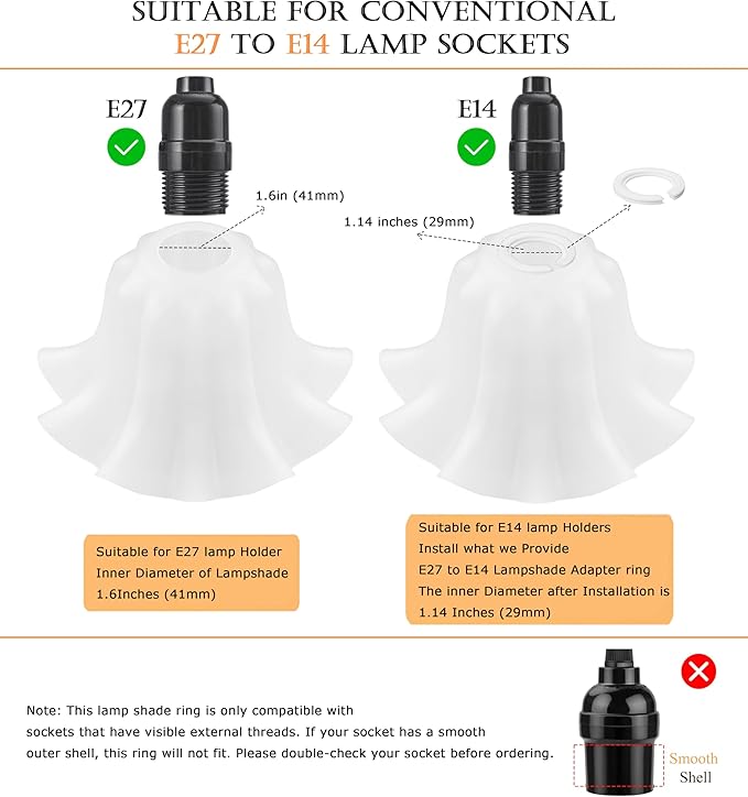 - Suitable for E27 and E14 lamp Sockets: Equipped with E27 to E14 lampshade adapter rings, 41mm to 30mm lampshade converter rings, and plastic lampshade replacement parts.