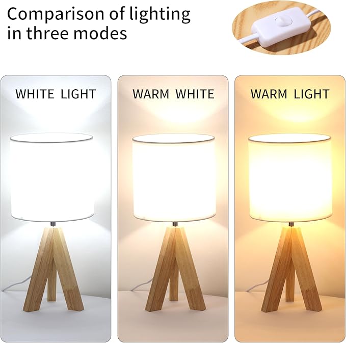 Table Lamp,Small Tripod Desk Lamp with Linen Fabric Lampshade,14.9",Tri-Color 5W Wooden Table Lamp for Living Room,Kids Room,Nursery (White)