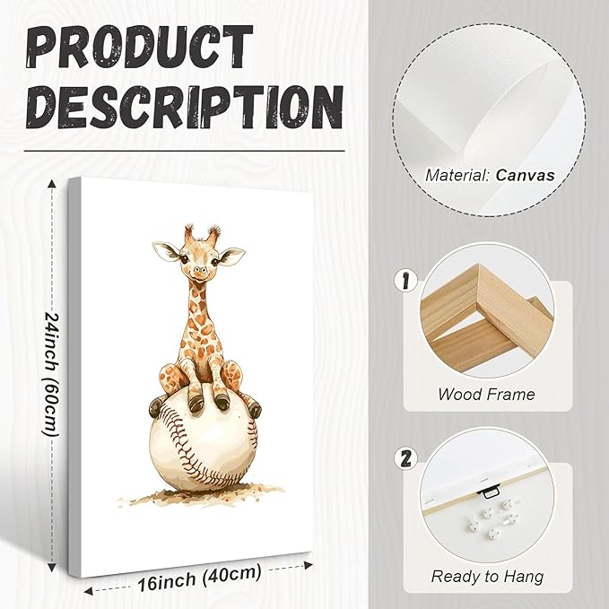 Sports Nursery Wall Art Baby Boys Room Canvas Pictures Safari Animal Wall Decor Jungle Nursery Prints Kids Poster Cute Painting Football Soccer Baseball Artwork for Bedroom 16x24x3 Inch Ready to Hang