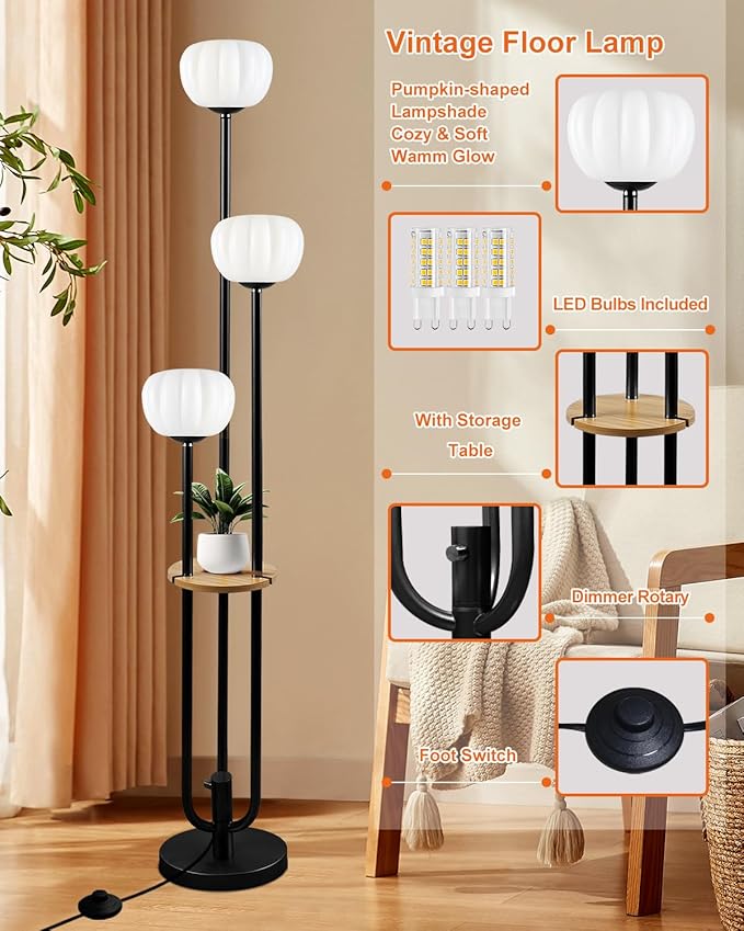 Lightdot Black Floor Lamp with Table, Modern Dimmable Floor Lamps with Pumpkin Lampshade, 3000K Soft Warm White Bulbs Included, 3-Light Tall Standing Lamp for Living Room/Bedroom