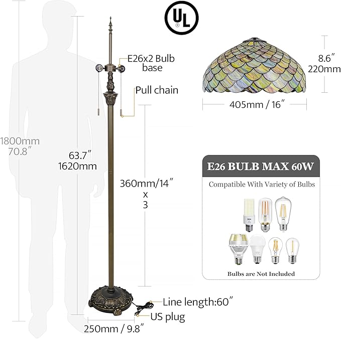 - Light Information: The lampshade's diameter is 16" (41cm) , The floor lamp's height is 64" (163cm). The resin base is antique bronze finished, weight 3.6KG, width 11" (28cm), makes it stable and reliable. Equipped with two pull chain switchs for easy operation.