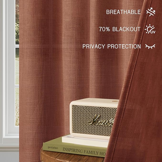 - 【Linen Texture】Sold as 2 panels,each panel is 52”W x 54”L,and 104” x 54”L in total.Crafted from a premium linen-polyester blend, the light filtering curtains add organic texture to modern spaces. The subtle weave creates depth while maintaining a clean aesthetic, perfectly complementing Scandinavian, Coastal, Bohemian, or Farmhouse room decor. Elevate your living room curtains or sliding door treatments with this adaptable design.