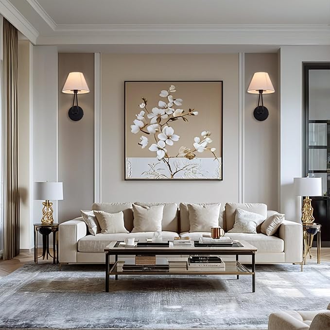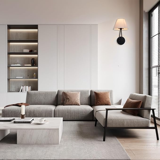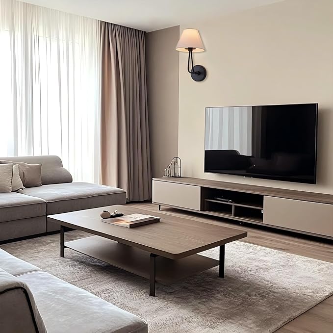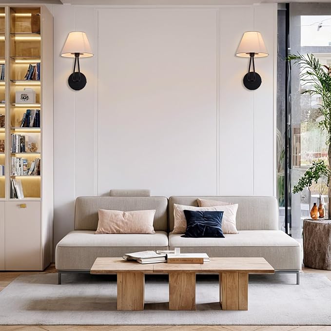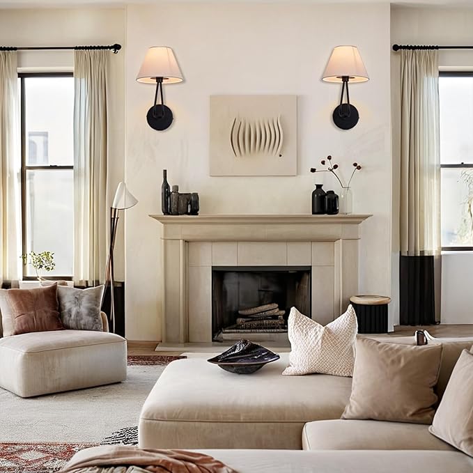 - DESIGN: The flared shape of the cream linen fabric lampshade (not pure white) with its unique twin angled arms design shows the mid-century vintage style look and warm lighting. The black wall sconce can be used in various indoor occasions to decorate your home