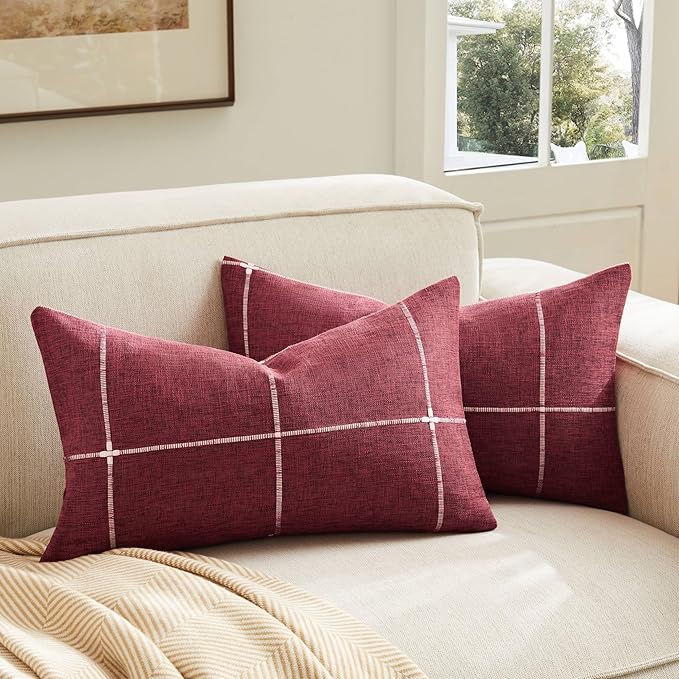 2 Packs Grid Embroidery Lumbar Throw Pillow Covers, 12x20 Inch Burgundy, Farmhouse Linen Decorative Red Cushion Covers for Sofa Bed Living Room Home Decor