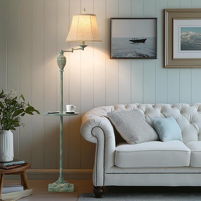 Traditional LED Floor Lamp with 350° Adjustable Swing Arm Lamp – Vintage Standing Pole lamp for Living Room, Bedroom and Office – Rustic Upright Floor Light for Home Décor with Silk Fabric Shade