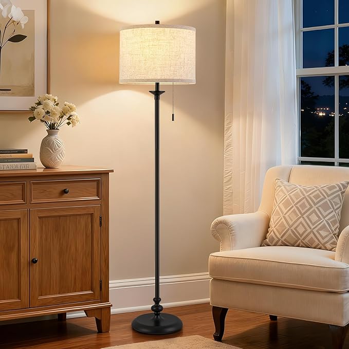 Luvkczc Black Floor Lamp, 60" Standing Lamp Tall Lamp with Fabric Lampshade&Pull Chain Corner Floor Lamps for Living Room, Bedroom & Office Bulbs Not Included
