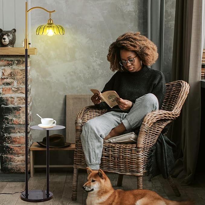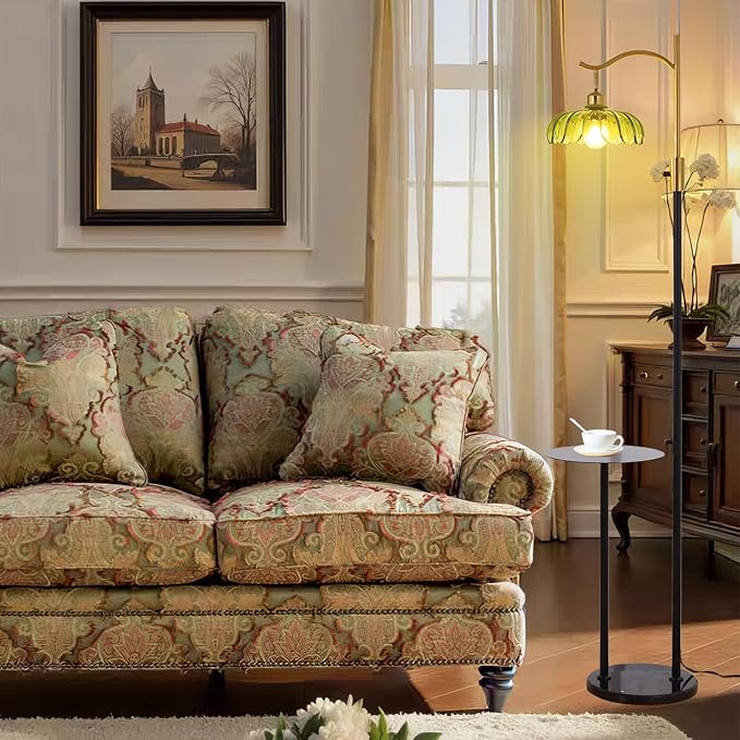 - 【Vintage Design】A mid-century modern floor lamp comes with an elegant green flower-shaped glass lampshade, and the angle of the lampshade is adjustable.Reflect and refract light when the lamp is on, creating a dreamy shadow effect.The tall standing lamp combines with a 11.8 in metaltable, which gives you a space for magazines, books, and coffee, keeping your visual space neat and tidy.