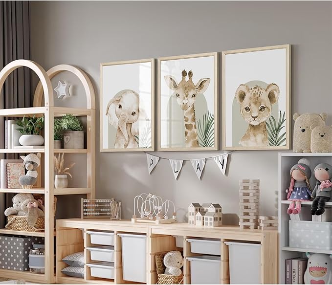 Animal Wall Art Pictures Baby Nursery Canvas Wall Art Decor Safari Animal Prints Jungle kids Wall Art Woodland Nursery Wall Decor Giraffe Jungle Poster for Room 16x24 Inch Wood Framed Set of 3
